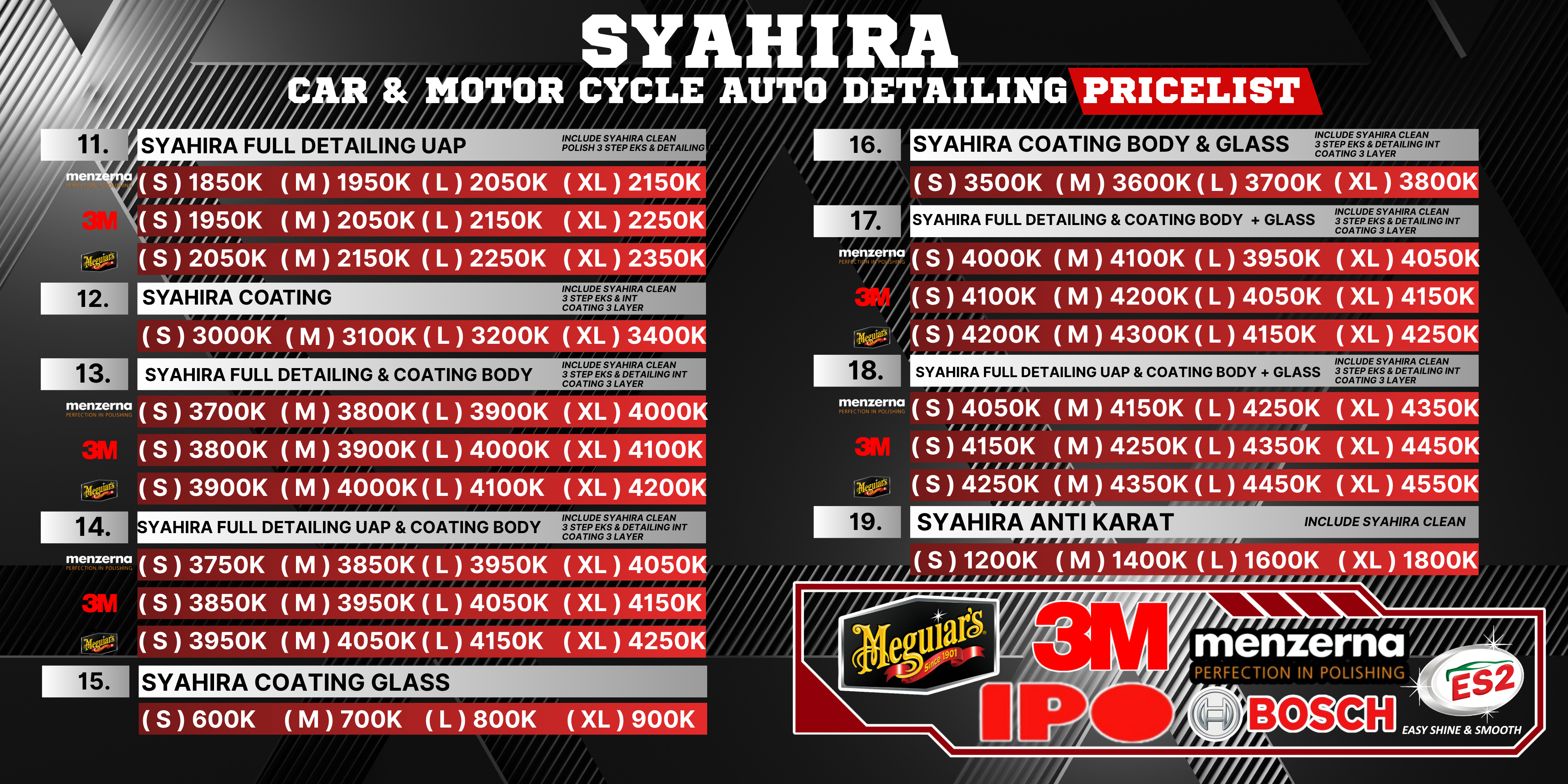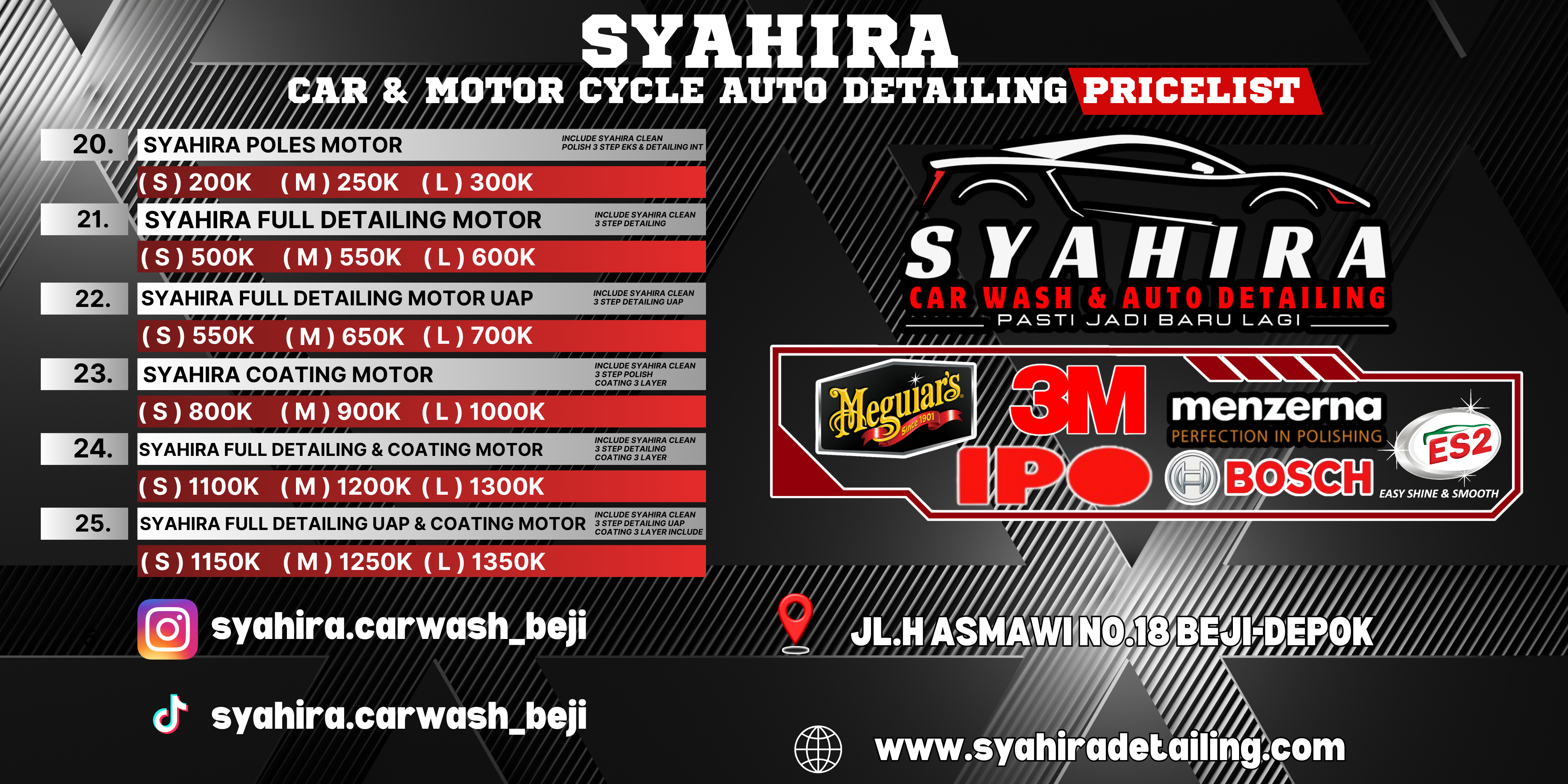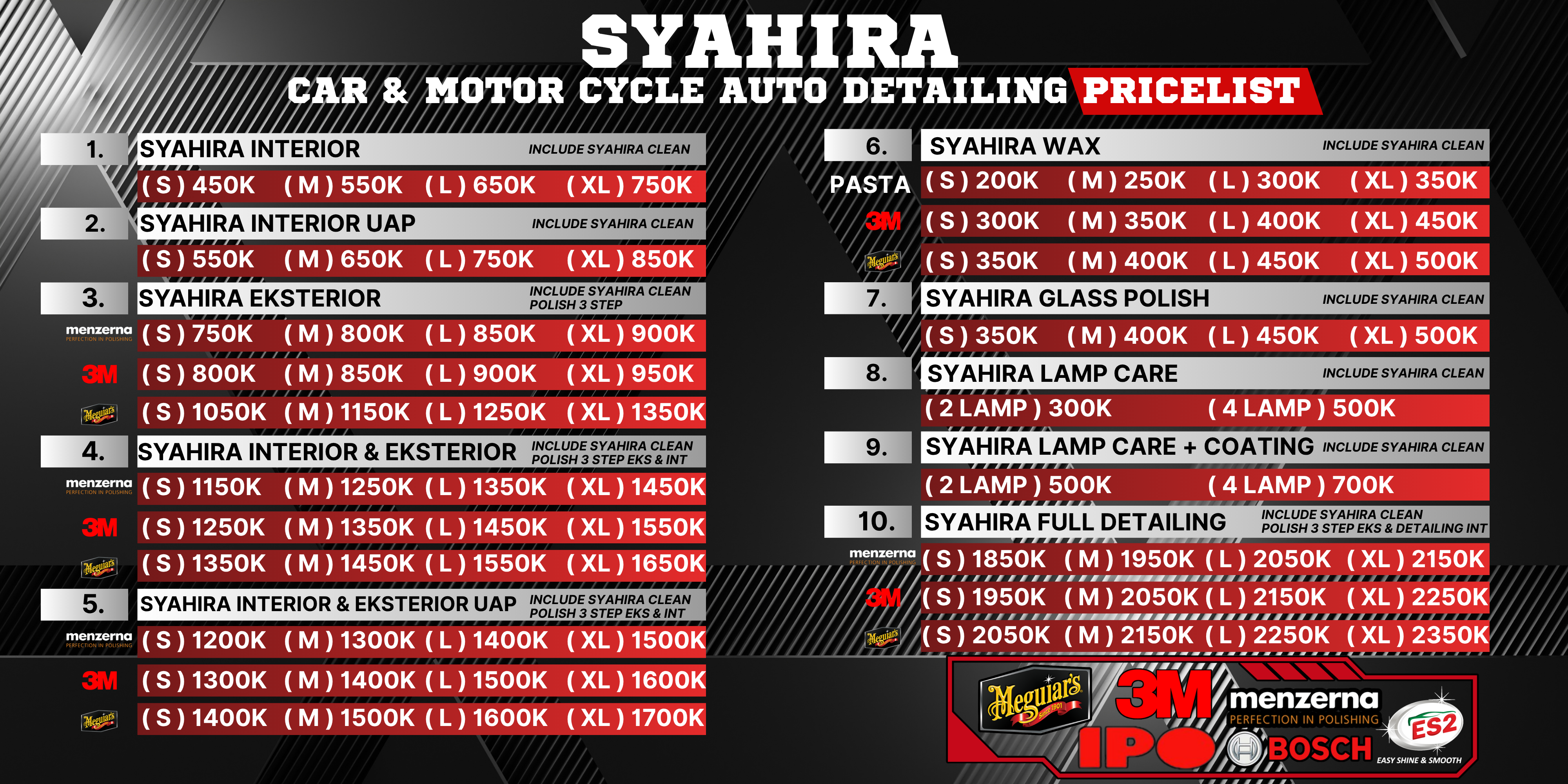 Daftar harga layanan profesional Syahira Auto Detailing. Klik pada gambar untuk melihat detail paket lebih jelas.